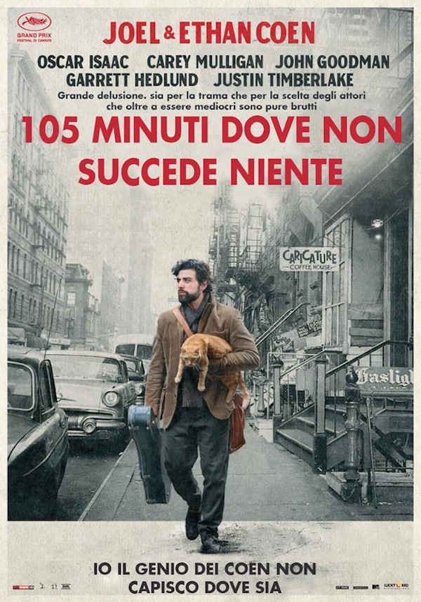 Tanto per fare un esempio degli ultimi successi molto apprezzati dalla critica e anche dal pubblico, non può non scappare da ridere, ad esempio, con la locandina dell’ultimo film dei fratelli Coen “A proposito di Davis” trasformato in “105 minuti dove non succede niente”.