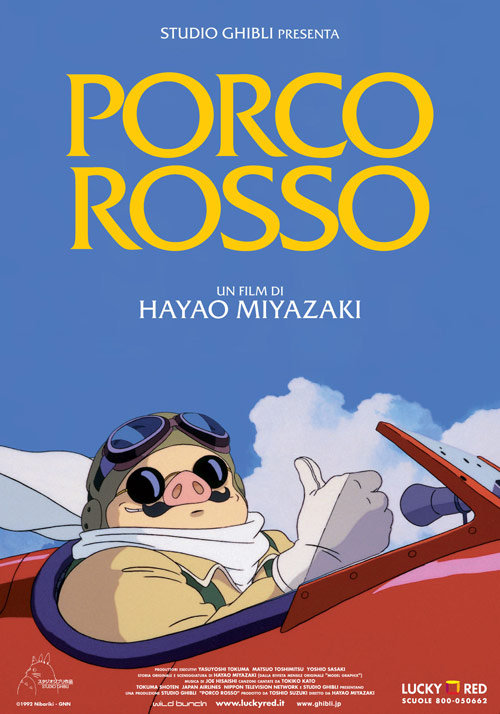 Porco Rosso (film d’animazione, di Hayao Miyazaki): durante la prima guerra mondiale Marco, un pilota dell’aeronautica militare, dopo un incidente rimane sfigurato in viso tanto da assomigliare ad un porco. Deciso a mantenersi, Porco Rosso darà la caccia ai pirati del cielo su cui pende una taglia.