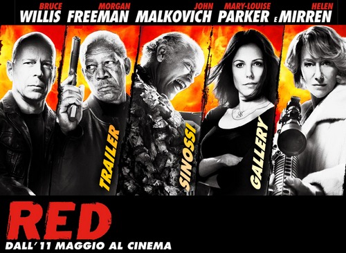 Red (commedia d’azione, diretto da Robert Schwentke, con Bruce Willis, Morgan Freeman, Mary-Louise Parker, Helen Mirren, John Malkovich, Julian McMahon, Karl Urban, Richard Dreyfuss, Brian Cox, James Remar, Ernest Borgnine, Michelle Nolden): Frank Moses è un ex agente segreto operativo della CIA, che ora vive una vita tranquilla e solitaria. Almeno fino al giorno in cui si fa vivo un commando armato, con l’intenzione di ucciderlo. Con l’identità compromessa, e la vita della sua compagna in pericolo, Frank è costretto a rimettere insieme la sua vecchia squadra, nel disperato tentativo di sopravvivere. Frank, Joe, Marvin e Victoria erano i migliori agenti segreti della CIA, e ciò che conoscono fa di loro un obiettivo sensibile. Dovranno usare tutta la loro astuzia, l’esperienza e la capacità di lavorare in team, per rimanere un passo avanti ai loro inseguitori mortali. La squadra così ricomposta, insieme all’aiuto della ‘civile’ Sarah, si imbarca in una missione impossibile, per fare irruzione nel quartier generale top-secret della CIA, e scoprire la più grande cospirazione governativa storia. La recensione