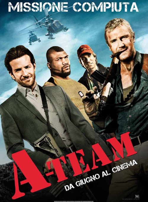 A-Team (azione, di Joe Carnahan, con Bradley Cooper, Liam Neeson, Quinton “Rampage” Jackson, Jessica Biel, Sharlto Copley, Patrick Wilson, Dirk Benedict, Dwight Schultz, Maury Sterling, Brian Bloom): Una squadra di veterani della guerra in Iraq viene accusata dai superiori di aver commesso un crimine di guerra. Innocenti, ma impossibilitati a dimostrarlo, il team decide di darsi alla clandestinità …. La recensione in anteprima.