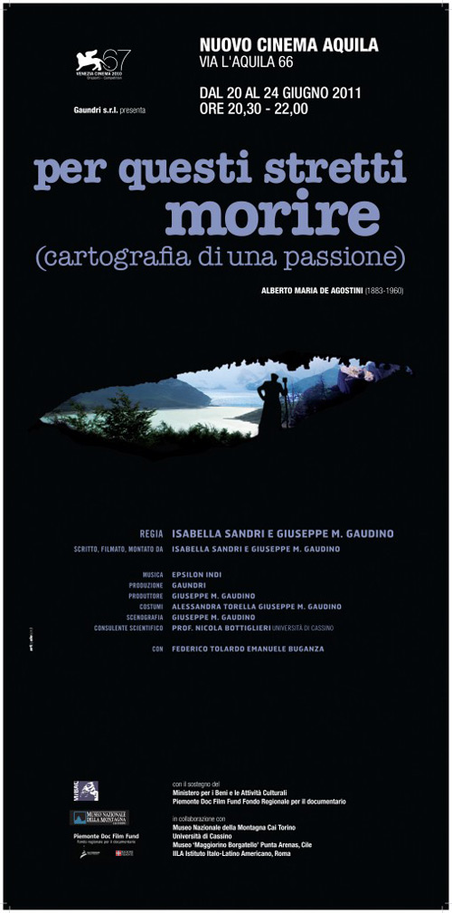 Per questi stretti morire – Cartografia di una passione (documentario, di Isabella Sandri, Giuseppe M. Gaudino): l’ostinazione, l’eccesso, i patimenti nella vita e nelle opere dell’esploratore cineasta e fotografo Alberto Maria De Agostini (1883-1960) arbitrariamente reinventate.