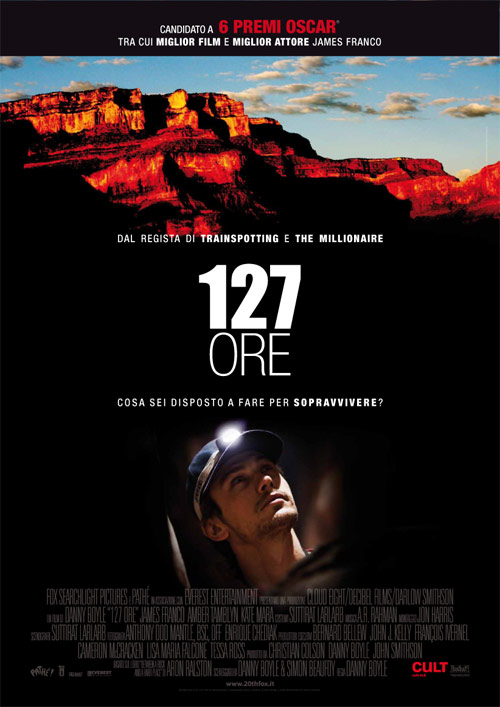 127 Ore (drammatico, di Danny Boyle, con James Franco, Amber Tamblyn, Kate Mara, Lizzy Caplan, Clémence Poésy, Kate Burton, Darin Southam, Elizabeth Hales, Norman Lehnert): La storia di Aron Ralston, escursionista bloccato in uno stretto canyon nello Utah, con un braccio schiacciato da un masso distaccato dalla roccia. La recensione.
