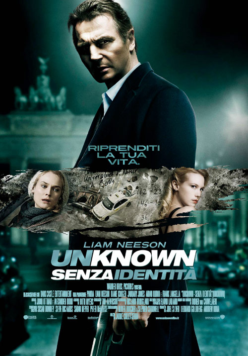 Unknown – Senza identità (thriller, di Jaume Collet-Serra, con Liam Neeson, January Jones, Diane Kruger, Frank Langella, Aidan Quinn, Bruno Ganz, Sebastian Koch, Sanny Van Heteren, Matthias Weidenhöfer, Stipe Erceg): Il dottor Martin Harris, vittima di un incidente stradale a Berlino, si risveglia dal coma e scopre che sua moglie non lo riconosce più perché un altro uomo si è impossessato della sua identità. Martin decide di tentare in tutti i modi di portare la verità alla luce e di rimpossessarsi della propria vita.