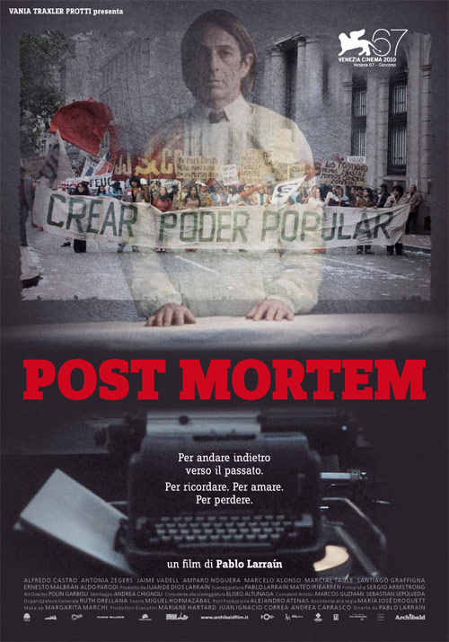 Post Mortem (film drammatico, di Pablo Larrain, con Alfredo Castro, Antonia Zegers): Mario, cinquantaduenne coroner, durante il colpo di stato cileno del 1973, si innamora di Nancy, la sua vicina di casa e ballerina di cabaret. Quando la ragazza scompare l’uomo decide di mettersi sulle sue tracce.