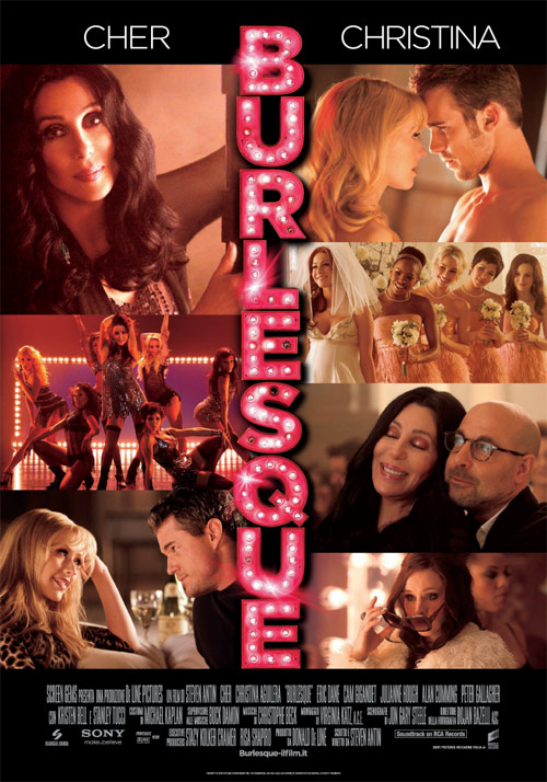 Burlesque (musical, di Steve Antin, con Kristen Bell, Cam Gigandet, Stanley Tucci, Alan Cumming, Eric Dane, Peter Gallagher, Cher, Julianne Hough, Christina Aguilera, Tanee McCall, David Walton, Black Thomas): Tess, ex ballerina e proprietaria di un teatro Burlesque, è costretta a combattere ogni giorno per tenere aperta la vecchia sala, affrontando problemi finanziari e artistici di ogni genere. Con i membri della troupe sempre più occupati dai loro problemi personali e la minaccia di un ricco uomo d’affari che vorrebbe mettere le mani sull’immobile, la buona sorte sembra avere abbandonato di colpo Tess. Nel frattempo, Ali, giovane ragazza di provincia in fuga del suo passato e assunta da Tess come cameriera s’innamora dell’arte del Burlesque e riesce ben presto a coronare il suo sogno di salire sul palco come ballerina.