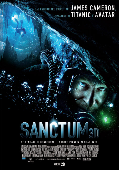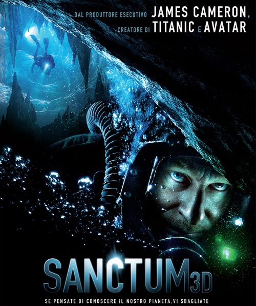 Sanctum (film d’avventura, di Alister Grierson, con Ioan Gruffudd, Richard Roxburgh, Alice Parkinson, Rhys Wakefield, Dan Wyllie, Allison Cratchley, Christopher Baker, John Garvin, Sean Dennehy): la storia di una squadra di speleologi che esplorano caverne sottomarine situate nel sistema di grotte più insidioso, inesplorato e meno accessibile al mondo. Una tempesta tropicale li obbliga a cercare rifugio all’interno di una grotta, molto in profondità. Lì devono combattere contro acque vorticose, in una situazione claustrofobica e di panico, mentre cercano una via di fuga che li possa condurre verso il mare.