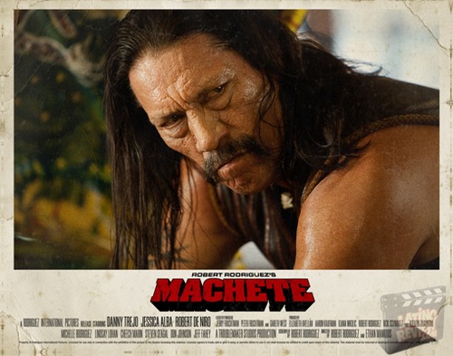 Le locandine, veramente geniali e cattivissime, immortalano: Danny Trejo (Machete), che mostra il suo set di coltelli e coltellacci che tiene sotto l’impermeabile; Steven Seagal (Torrez), che impugna una spada; Don Johnson (Lt. Stillman), di profilo con un coltello in mano; la bendata a un occhio Michelle Rodriguez (Shé) con un mitragliatore nella mano sinistra, una pistola nella mano destra e una nella fondina; la bella Jessica Alba (Sartana) con distintivo alla cintura e pistola di piccolo calibro nella mano destra; Robert De Niro (The Senator) frontale che impugna due pistole identiche.