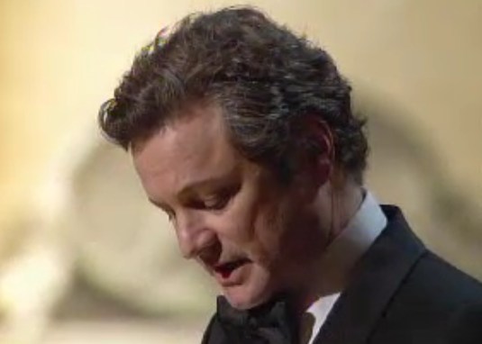 5.19. Sandra Bullock presenta la cinquina del Miglior Attore Protagonista, partendo da Javier Bardem. Anche in questo caso nessuna sorpresa: vince Colin Firth per Il discorso del re. Per lui la seconda nomination consecutiva e la prima vittoria. Con questo premio il film sale a tre riconoscimenti come The Social Network, uno in meno di Inception (che ha fatto incetta di premi tecnici). Il prossimo deciderà realmente quale è il film dell’anno.