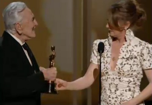 2.51. Entra Kirk Douglas. Tutti in piedi per lui. L’attore ringrazia i conduttori a modo suo, prendendo in giro James e ammirando Anne. Douglas annuncerà la vincitrice della categoria Migliore Attrice non protagonista. L’attore continua a scherzare poi annuncia …