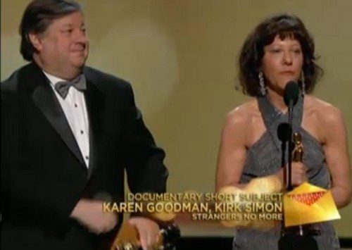 4.19. Amy Adam Jake Gyllenhaal annunciano i vincitori delle sezioni cortometraggi. Nella categoria Cortometraggio Documentario vincono Karen Goodman e Kirk Simon per. Strangers No More.