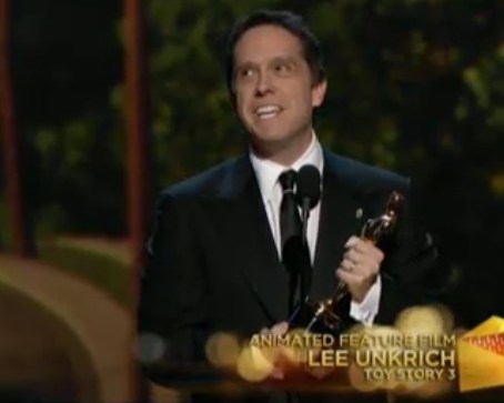 3.05. Ora viene annunciato il vincitore della categoria Miglior Film d’Animazione. Vediamo chi vince… Toy Story 3. Ovvi ringraziamenti a quelli che hanno collaborato alla riuscita del film. Un ricordo anche alla nonna. Tre Thank You concludono il discorso.