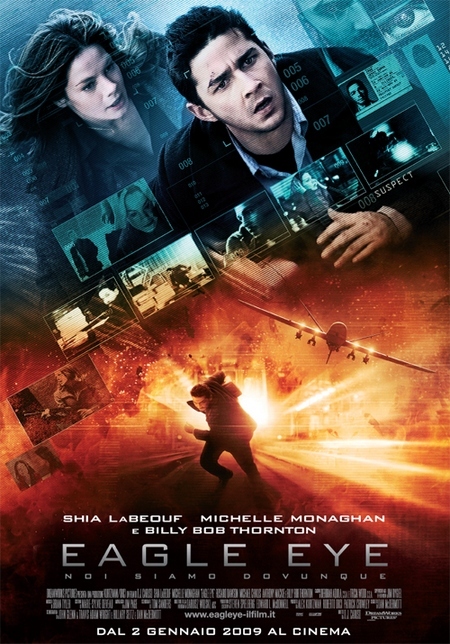Eagle Eye (Thriller, diretto da D.J. Caruso, con Shia LaBeouf, Michelle Monaghan, Rosario Dawson, Billy Bob Thornton, Eric Christian Olsen, Ethan Embry, William Sadler, Michael Chiklis): Jerry, dopo aver perso per cause inspiegabili il fratello, si ritrova sul suo conto un mucchio di soldi e in casa armi e passaporti falsi. Jerry è diventato parte di un piano terroristico da cui non sa come tirarsi fuori. Nella stessa situazione si trova Rachel, una giovane mamma single. Che fare?
